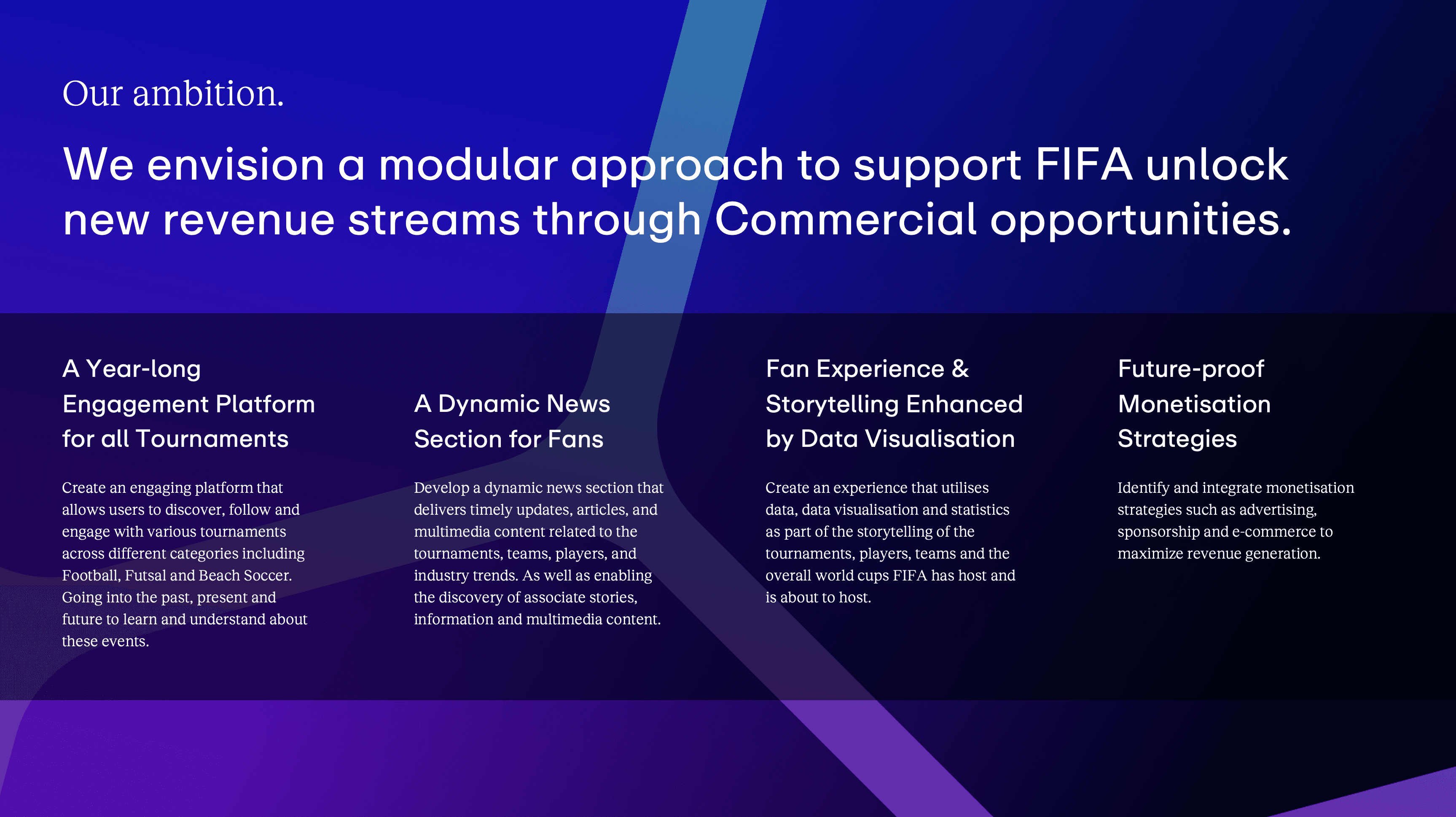 The initial concept work explored a north star experience for FIFA.com: a unified, modular platform capable of supporting year-long engagement across all tournaments, enhancing discovery, storytelling, and monetisation.