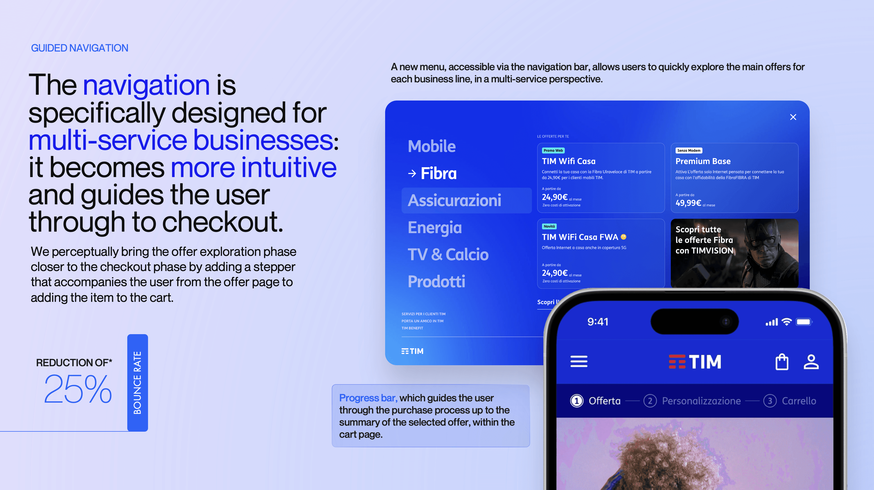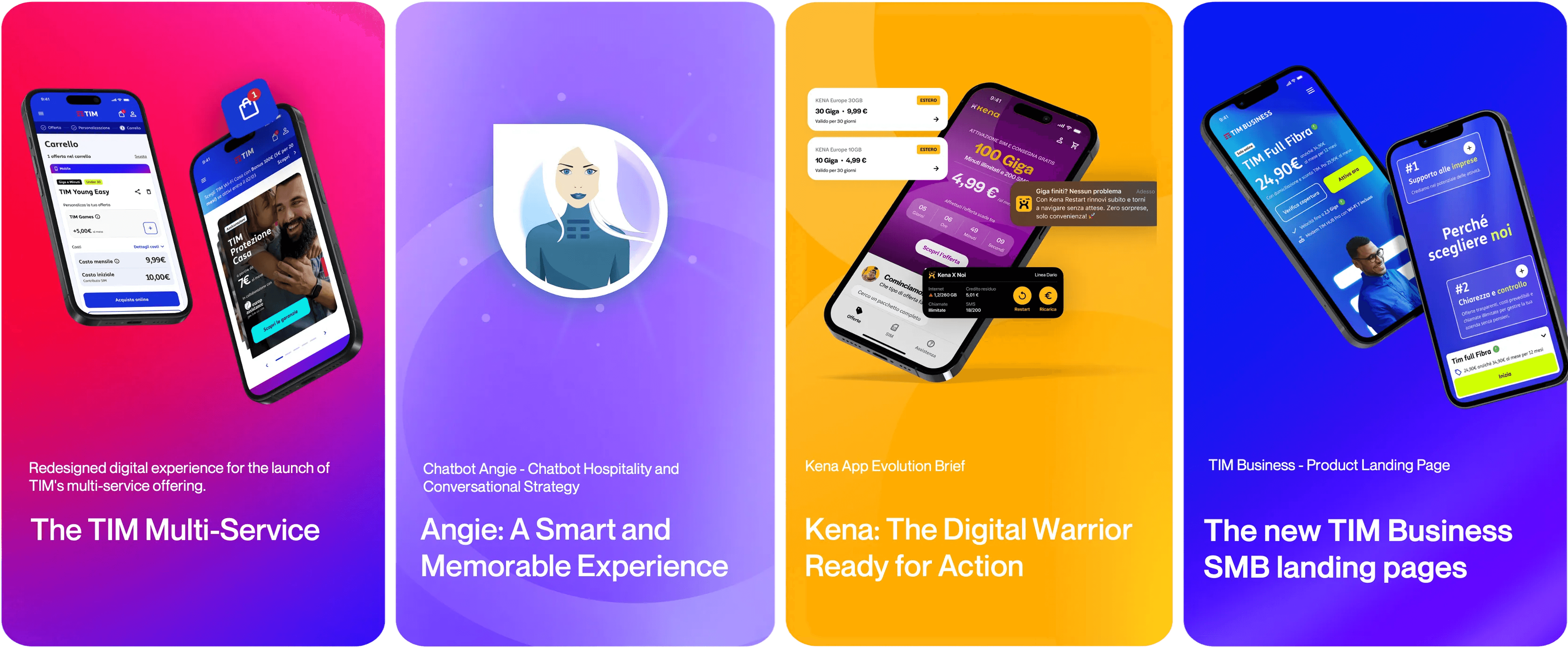 Starting from core TIM purchase journeys, we explored ways to simplify funnels and reduce friction, prioritizing faster decision-making and postponing complexity to post-purchase moments. In parallel, a mobile-first redesign for Kena investigated more direct, engaging interactions and a stronger brand character, grounded in metric-driven comparisons and benchmarks.